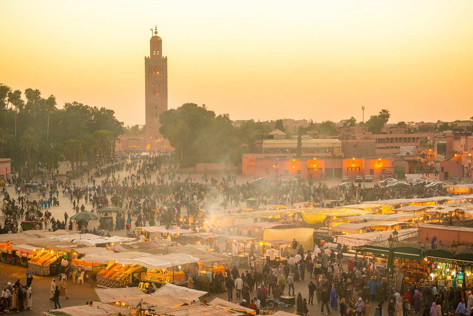 Tagsüber ist der Djemaa el Fna im Herzen von Marrakesch wie jeder andere große Platz auch. Hier warten Kutscher im Schatten der Palmen auf Touristen, dort laufen Kinder über den Platz, und im Hintergrund erhebt sich das mächtige Minarett der Koutoubia-Moschee. Doch wenn die Dämmerung kommt, verändert sich alles.