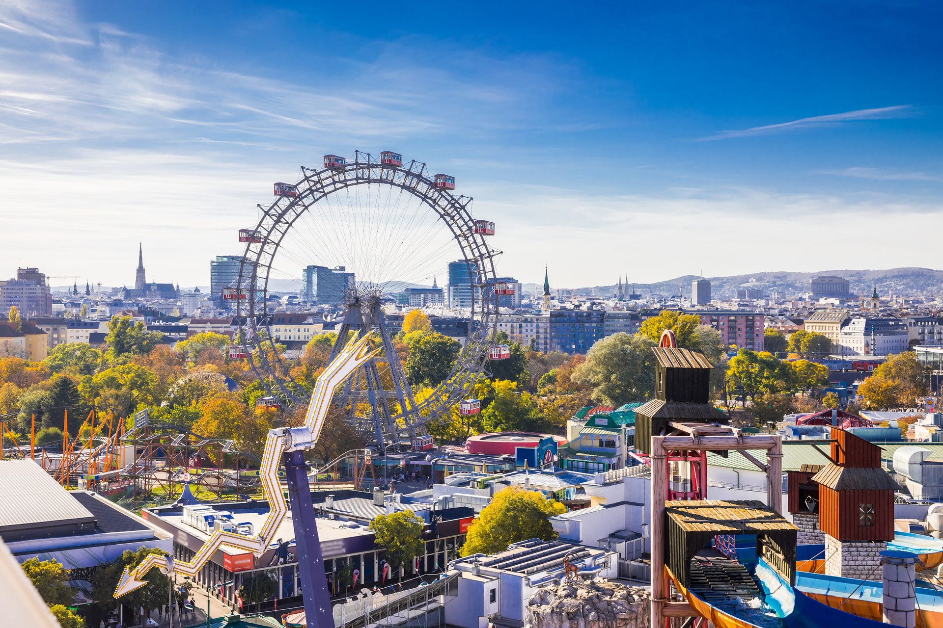 Zu einem Urlaub in Wien gehört eine Fahrt mit dem berühmten Riesenrad einfach dazu. Es steht im Wiener Prater, dem zweitgrößten Vergnügungspark der Welt. Das gigantische Holzrad stammt aus dem Jahr 1897. Bei der unvergesslichen Fahrt geht es hoch hinaus: Das Riesenrad erreicht eine Höhe von 65 Metern. Dank des niedrigen Tempos habt ihr viel Zeit, euch die Stadt aus der Vogelperspektive anzuschauen und Fotos zu schießen.